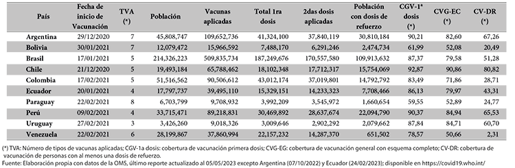 La tabla Nº1 refleja la información disponible sobre la situación de la vacunación contra el covid-19 en Sudamérica hasta el levantamiento de la declaratoria de emergencia sanitaria internacional por Covid-19, resaltando que el proceso de inmunización abarca a una media de 73,02% de la población general con esquema completo de vacunación según los tipos de vacunas aplicados en cada país; sin embargo, se observan grandes diferencias entre los países con las mayores coberturas de vacunación como Chile (90,86%), Perú (84,94%) y Uruguay (84,71%), comparados con los más bajos reportados por Venezuela (50,66%), Bolivia (52,08%) y Paraguay (52,89%). También se resalta que las coberturas de vacunación de las dosis de refuerzo son menores a la cobertura general en todos los países, siendo los más altos en Chile (80,82%), Argentina (67,26%) y Perú (65,53%), comparados con los más bajos reportados por Venezuela (2,31%), Bolivia (20,49%) y Paraguay (24,77%).