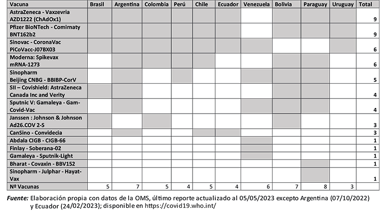 Según los registros de la OMS, en Sudamérica se aplicaron 14 tipos de vacunas, de las cuales las más utilizadas fueron AstraZeneca (Vaxzevria-AZD1222 - ChAdOx1) y Pfizer BioNTech (Comirnaty- BNT162b2) en 9 de los 10 países. Resaltando también que Argentina y Bolivia fueron los países que mayor variedad de vacunas contra el covid-19, pues utilizaron hasta el momento 7 variantes de las vacunas; a diferencia de Uruguay que solo aplicó 3 tipos diferentes de vacunas hasta el momento del ultimo reporte previo al levantamiento de la emergencia sanitaria internacional por Covid-19. (Ver tabla 2).