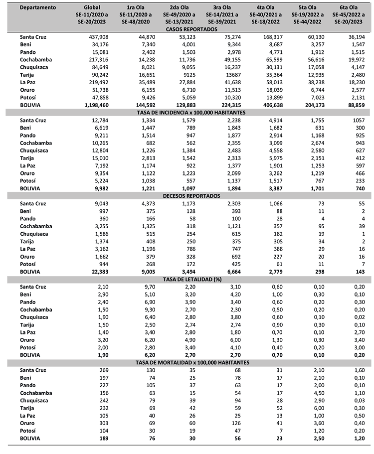 Se reportaron un total de 1,198,460 casos confirmados acumulados en las 6 olas, con una tendencia decreciente entre la primera ola (n=144,592 casos) hasta la 6ta ola (n=88,859 casos); también se resalta un comportamiento estacional de las olas epidémicas, debido a que se reportaron un mayor número de casos confirmados en las temporadas de invierno (1ra, 3ra y 5ta) y de verano en cada gestión (2da, 4ta y 6ta). Los departamentos con mayor número de caso acumulados corresponden al eje central de Bolivia, encabezado por Santa Cruz (n=4037.908 casos), la Paz (219,492 casos) y Cochabamba (n=217,316 casos); a diferencia de Pando (n=15,081) y Beni (n=34,176 casos) que tuvieron los reportes acumulados más bajos. La cuarta ola fue donde se reportaron la mayor cantidad de casos acumulados (n=406,638 casos) y la más baja en la 6ta ola epidémica con 88,859 casos acumulados hasta el momento del reporte. La tasa de incidencia por cada 100,000 habitantes refleja una incidencia acumulada de 9,982x100mil habitantes; habiéndose reportado la mayor incidencia en la cuarta ola epidémica con 3,387x100mil habitantes y la más baja en la sexta ola con 627 casos por cada 100,000 habitantes. El departamento más afectado fue Tarija con una Tasa de incidencia acumulada de 15,010 casos por cada 100,000 habitantes; siendo la cuarta ola la de mayor incidencia (5,975x100mil hab.) y la más baja en la 6ta ola con 412x100mil habitantes. La menor incidencia acumulada fue reportada en Potosí con 5,224 casos acumulados por cada 100,000 habitantes; siendo la cuarta ola la de mayor incidencia (1,517x100mil hab.) y la más baja en la 6ta ola con 233x100mil habitantes