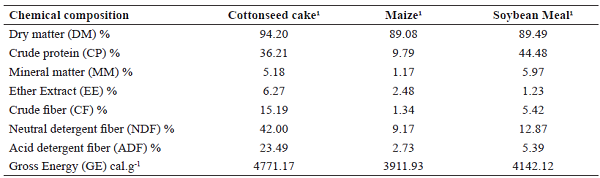Cottonseed cake is commonly used to fed ruminants because of its high fiber content, but it also has between 30 and 43% protein (ROSTAGNO et al., 2017). For that reason, cottonseed cake has also been studied in poultry diets to evaluate the metabolisability and chicken performance (CARVALHO et al., 2010; MIRANDA et al., 2017; SANTOS e al., 2013).