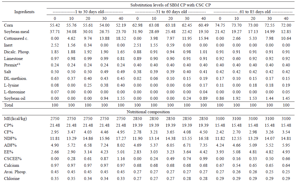 A total of 450 one-day old naked neck chickens of both sexes with a mean weight of 36.26 ± 2.5 grams were used. The experiment was conducted in a completely randomized design (CRD) with repeated measures. The treatments consisted of four substitution levels of soybean meal crude protein with cottonseed cake crude protein (0, 10, 20, 30 and 40%) with six replicates per treatment and fifteen birds per replicate. Repeated measures were performed for three evaluation periods: 1 to 30, 1 to 60 and 1 to 85 days of age.