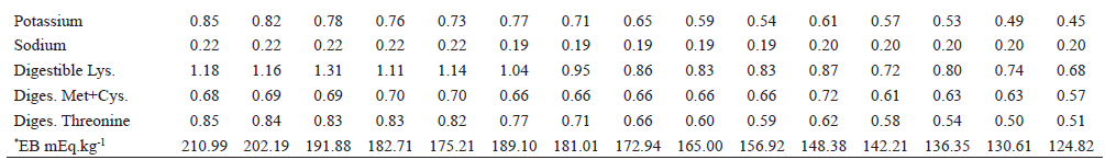 The diets were formulated to meet the nutritional requirements of chickens in the starter (1 to 30 days), grower (31 to 60 days) and finishing phases (61 to 85 days) according to the chemical composition of the cottonseed cake, maize and soybean meal (Table 1), following the recommendations of Sakomura et al. (2014) for naked neck strain. The electrolyte balance of diet was calculated according to Mongin (1981): (mg.kg-1 Na+ from feed/22.990) + (mg.kg-1 K+ from feed/39.102) - (mg.kg-1 Cl- from feed/35.453) (Table 2).