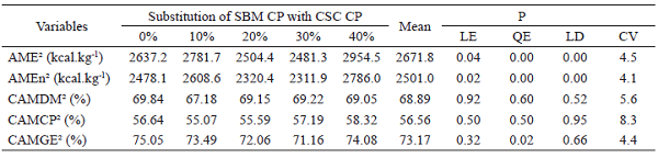 From the data above, the coefficients of apparent metabolisability of dry matter (CAMDM), crude protein (CAMCP) and gross energy (CAMGE) were determined by the ratio of AMEn and gross energy (GE) of the diets, according to the formula: