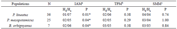 Mean Ho values were lower than the mean He values in the three species, being corroborated by the observed positive Fis. Mean Fis was higher for P. lineatus (0.384), where with all loci presenting heterozygous deficits, and lower for B. orbignyanus (0.044), with only five loci showing heterozygous deficits. Deviations from the Hardy-Weinberg equilibrium (p < 0.05) were observed in five (Par12, Par14, Par21, Pli30, and Pli60), three (Pme5, Pme14 and Pme20), and two (BoM13 and Bh13) loci for P. lineatus, P. mesopotamicus, and B. orbignyanus, respectively (Table 1). This deviation may have been caused by inbreeding, bottleneck effects or a combination of both. The Bottleneck analysis showed heterozygotes excess (p < 0.05) in the three populations only in the IAM, with P. lineatus presenting the lowest p value (0.01) in the Wilcoxon test (Table 2). According to Cornuet and Luikat (1996), populations that have experienced a recent reduction in effective population size tend to have an Ho greater than the He in the equilibrium of mutation and drift. In view of this, it is probable that the P. lineatus population was more influenced by recent population reductions and/or inbreeding, which resulted in the deviation of HWE observed in most loci.