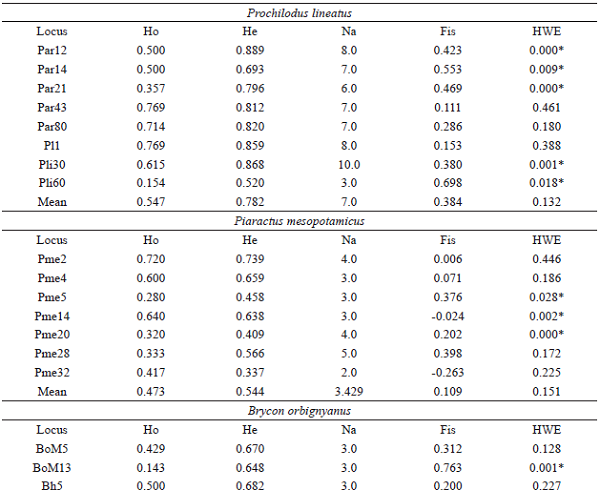 Keywords: Brycon orbignyanus, Conservation, Genetic variability, Microsatellites, Piaractus mesopotamicus, Prochilodus lineatus.