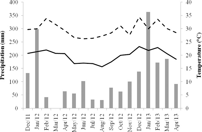 The experiment was conducted at the Experimental Field of the Department of Animal Nutrition and Pasture of the Instituto de Zootecnia of the Universidade Federal Rural do Rio de Janeiro, Seropédica city, Brazil, at 22° 45′ southern latitude and 43° 41′ western longitude and 33 m a.s.l. The trial period comprised one year and five months, starting on December 20, 2011 and ending on May 3, 2013. The climate of the region is Aw (Köppen), with a dry season that runs from April to September and a hot and rainy season from October to March. Climatic data for the determination of the water balance (THORNTHWAITE; MATHER, 1955) in the experimental period were obtained from the website of the Instituto Nacional de Meteorologia, based on data from the Estação Experimental de Seropédica, and are shown in Figures 1 and 2.