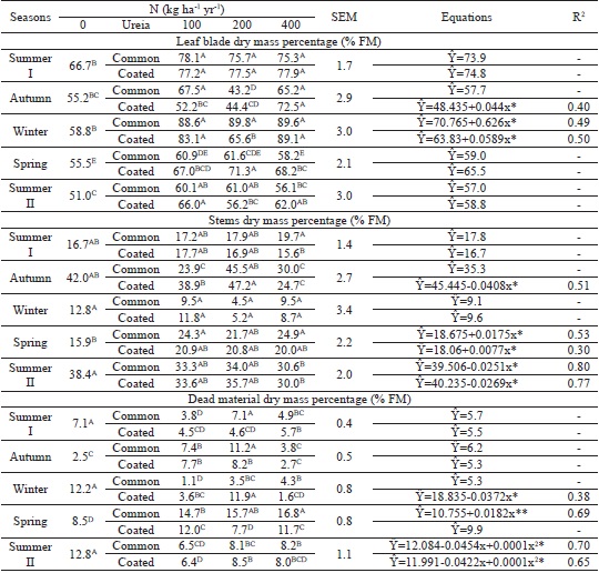 There were interaction effects (p < 0.0001) between urea source, N dose, and season on LBDMP, SDMP, and DMDMP (Table 2). The use of coated urea resulted in a linear increase in LBDMP and a linear reduction in SDMP in the fall. This effect was considered to be beneficial for obtaining forage with greater participation of leaf blade dry mass and smaller stem and dead material dry masses, mainly in dry periods, culminating in a possible higher nutritive value. Similar behavior was observed in winter, with a positive linear effect on LBDMP for both sources of urea and a decrease in DMDMP only for coated urea. In spring, there was no effect of N dose on LBDMP, and there was a linear increase in SDMP for both sources of urea, whereas DMDMP increased linearly only for common urea, which is not beneficial to the fodder produced in this same season. This effect seems to be directly related to the water deficit observed in the spring, especially in October (Figure 2). At the physiological level, this effect may be related to the N fertilization response, as N is the main constituent of proteins that actively participate in the synthesis of the organic compounds that determine structural plant characteristics such as leaf size, tiller and leaf density per tiller, as well as morphogenic characteristics, such as leaf appearance and leaf elongation rates (COSTA et al., 2006).