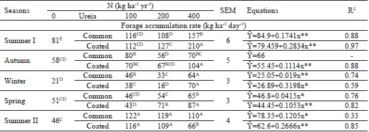 There was an interaction effect (p < 0.0001) between urea source, N dose, and season on FAR (Table 3). Fertilization at 400 kg ha-1 year-1 of N of coated urea promoted higher FAR in summer I, autumn, and spring (210, 104, and 87 kg ha-1 day-1, respectively), reflecting the potential of massai grass in the face of the diversity of climatic conditions observed during these periods. This fact was confirmed by the positive linear behavior of FAR for both sources of urea in all seasons, except for the use of common urea in autumn (no effect). Costa et al. (2009) reported that the positive effect of N rate on forage production may be related to the fact that N supply by the soil does not normally meet the nutritional requirements of grasses, and the effect of N can be attributed to its substantial influence on the physiological processes of the plant (PORTO et al., 2014).