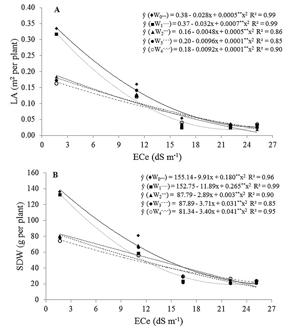 The increase in soil salinity caused severe inhibition on leaf area expansion (Figure 1A), resulting in reductions of 42, 84, 87 and 88% for salinity levels of 11.07, 16.44, 22.14 and 25.20 dS m-1, respectively, compared to the mean values for plants grown in soil of low salinity (EC = 1.70 dS m-1). These decreases in shoot biomass (Figure 1B) were 34, 74, 77 and 78% for soil salinity levels of 11.07, 16.44, 22.14 and 25.20 dS m-1, respectively.