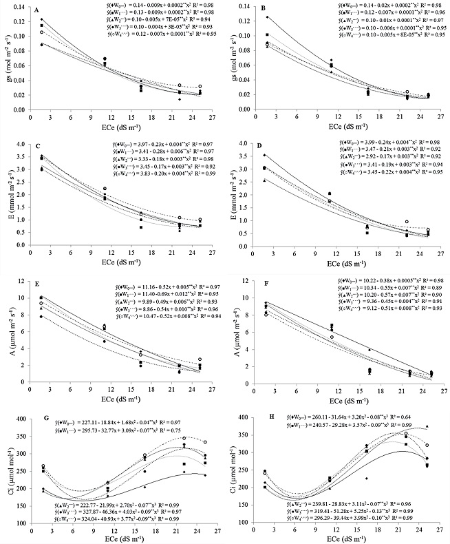 The lowest values for photosynthetic rate (A) were seen in plants grown in soils with ECe of 16.44, 22.14, and 25.20 dS m-1, irrespective of the number of waterlogging cycles (Figures 2E, F); whereas the greatest mean values for A were found when the plants were grown in soil of control salinity (1.70 dS m-1) and not subjected to any waterlogging cycle. Comparing the measurements for A, before and after the waterlogging cycles, reductions of 71, 83, and 78%, and of 77, 86, and 87%, were recorded for plants grown in soils with the greatest salinities (16.44, 22.14 and 25.20 dS m-1), respectively. Minimum values of 2.02 µmol m-2 s-1 were estimated for plants grown in soil of the highest salinity before imposition of the fourth waterlogging cycle, and of 0.99 µmol m-2 s-1 after the fourth cycle (Figure 2F).