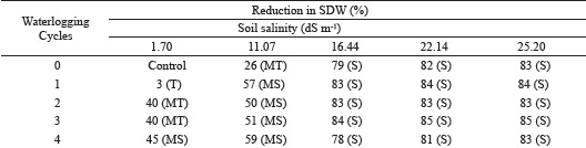 Salinity, expressed by the electrical conductivity of the saturated soil extract (ECe), allowed the plants to be classifield as moderately tolerant to ECe of 11.07 dS m-1, without waterlogging, and as moderately sensitive when exposed to one or more waterlogging cycles. On the other hand, at the more severe levels of soil ECe (16.44, 22.14 and 25.20 dS m-1), waterlogging had no significant influence on dry shoot biomass, and plants were classified as sensitive, regardless of the number of waterlogging cycles (Table 1).