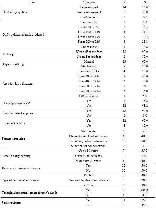Most farms (70%) were characterized by pasture-based systems, whereas semi-confinement systems accounted for 30% of the total number of farms. Pasture-based systems included traditional farms, comprising crossbred animals, degraded pastures, and restricted supplementation throughout the year. On the other hand, semi-confinement systems were characterized by improved systems, intensive grazing, and concentrated supplementation during the summer, and roughage and concentrate supplementation during winter. The stratification of farms by the volume of milk and area showed a predominance of small-scale production units (up to 250 L day-1) and establishments with area less than 60 ha, which is consistent with previous estimates that 78% of the farms in the region have an area of less than 100 ha (IBGE, 2006). The type of milking was identified as mostly manual (65%) and with calf at the foot (90%), indicating the low level of technification in the family production systems. The results also showed that most of the farmers (60%) resided in the property and had been in the business for up to 20 years (60%). Residing on the property allows management and close monitoring of the activity, easy identification of problems, and the possibility of making decisions quickly. On the other hand, the low level of education among rural producers is likely to contribute to the difficulty of introducing new technologies. In addition, although only half of the farmers received technical assistance, in the interviewees' perception, it was sufficient to meet their needs (Table 1).