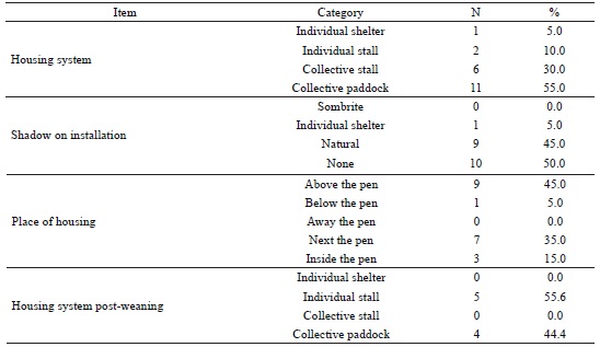 A minority (18.8%) of the properties used individual housing systems (Table 3). The advantages of individual housing systems include control of milk, concentrate, and water consumption for each animal, facilitated perception of behavioral changes, and minimizing the contact between individuals, thereby, reducing the spread of diseases and the mortality rate. Despite the benefits of individual housing systems, the handling of cows with calves at foot makes it difficult to incorporate. Thus, in this case, it is important to distribute the calves according to age in small batches to ensure good observation and minimize promiscuity among animals (COELHO, 2005). Furthermore, the housing systems were located predominantly above (45%) or alongside the pen (35%), which is an important practice to reduce the risk of contamination and infection challenges.