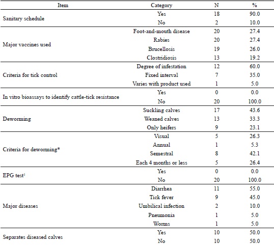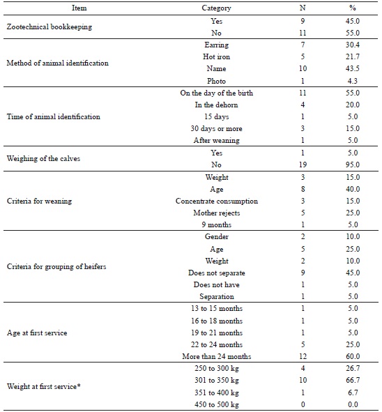 Adequate sizing of the herd aims at rational exploration of the area destined to the production system (LOPES et al., 2008). The studied herds comprised 200 calves (up to 12 months of age) and 157 heifers (over 12 months of age), with an average of 10 calves and 7.9 heifers per property. However, analysis of the number of animals per category indicated that the herds were not correctly sized (Table 2). Some properties showed a higher number of calves and heifers, whereas others showed a lower than ideal replacement of animals, which may be due to the high mortality of young animals, sale of animals without adequate planning for replacement, and absence of herd sizing. In addition, 21.1% of the herds raised male calves, a practice that may compromise the economic efficiency of the activity if conducted without planning, due to the high cost and low performance of dairy males.
