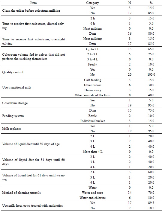 Colostration plays a key role in ensuring the passive transfer of immunoglobulins to newborn calves, in addition to being a source of nutrients and energy (GODDEN, 2008). In the familial milk production systems involved in this study, it was observed that colostration was not performed correctly. In most of the farms (80%), the amount of colostrum ingested after birth was not monitored, whereas, in the calves that did not performing the suckling themselves, the volume of colostrum provided was limited to 2 L (65%). It was also observed that only 15% of the farmers provided transitional milk for the calves. Although studies have shown that the absorption of immunoglobulins present in colostrum through the intestinal epithelium to the neonate's circulation occurs within the first 24 h after birth (WEAVER et al., 2000), the supply of transition milk may hinder the adhesion of bacteria to the intestinal wall, leading to reduction in incidences of diarrhea during the first weeks of life (COELHO, 2005), and economic advantage (LOPES; VIEIRA, 1998). In addition, neither of the farms evaluated the quality of colostrum and only one of them froze colostrum for emergencies, practices that are widely recommended for successful rearing of young animals (McGUIRK; COLLINS, 2004), especially in small dairy farms (<200 L/day), whose susceptibility to disease is higher due to the use of colostrum with low nutritional and microbiological quality (SANTOS et al., 2017). The results also showed that the majority (75%) of the family properties used natural suckling. For those who used artificial liquid-feeding system, it was identified that the volume of daily milk supplied to calves until weaning ranged from 2 to 4 L. The utensils used to feed calves were washed with water and soap in 70% of the farms and the milk supply of cows treated with antibiotics occurred in 89.5% of the farms (Table 5), a factor that may cause bacterial resistance, given the supply of antibiotic sub-doses from the milk of treated cows and the high bacterial load present in discarded milk (MAYNOU et al., 2017).