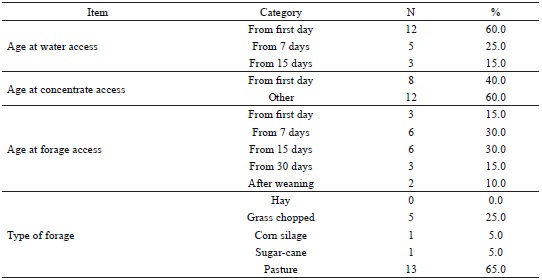 In the present study, the practice of water supply from the first day of life in calves occurred in 60% of the farms, whereas, in 25% and 15% of the properties, the water was offered only from the seventh and the fifteenth days, respectively. Concentrate was offered from the first day in 40% of the properties and from the second to the fifteenth day in the others. The early water supply is important because it affects the initial consumption of concentrate (KERTZ et al., 1984). On the other hand, the consumption of concentrate as early as possible stimulates rumen development and enables early weaning of calves (QUIGLEY et al., 1991). Forage was available for the calves from the first day of life in 5% of the properties, whereas 30%, 30%, 15%, and 20% of the properties offered the forage from the seventh, fifteenth, thirtieth day, and after weaning, respectively. The type of forage offered to the calves consisted predominantly of grass (64.7%) and chopped forage (23.5%), while females older than 12 months had access to pasture (42.5%) or received sugar-cane (Saccharum officinarum) in the trough (22.5%). Although the forage intake during the suckling phase supports the physical development of the rumen (HILL et al., 2008), the altered fermentation profile slows down the growth of ruminal papillae (KHAN et al., 2011). In contrast, recent studies have supported the use of forage for calves during the suckling phase as a strategy to increase the concentrate intake and weight gain, and reduce abnormal calf behavior (CASTELLS et al., 2012; IMANI et al., 2017; TERRÉ et al., 2013), especially in intensive rearing systems. In addition, as the physical form of the forage may influence the development of the rumen (CASTELLS et al., 2012; MONTORO et al., 2013), the availability, digestibility, and percentage of leaves are important factors to be considered for optimizing the development of calves.