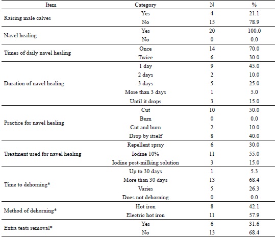 Among the management practices adopted in calf rearing are navel healing, dehorning, and removal of extra teats. Although all the interviewed producers performed navel healing, 55% of them performed umbilical antisepsis for 1 to 2 days, a practice that could be extended for at least three consecutive days (COELHO, 2005). In a previous study, there was a significant reduction in the risk of umbilical infection when umbilical cord care was performed (GROVER; GODDEN, 2011). While the use of 7% alcohol-iodine solution or, alternatively, 2% chlorhexidine gluconate solution has been considered standard for navel healing (ROBINSON et al., 2015; WIELAND et al., 2017), in the present study, a fraction of the farmers (46.6%) used inappropriate treatment (e.g., repellent spray and iodine solution used for post-milking dipping), which may lead to treatment failure, consequently leading to omfalitis, omphalophlebites, hernias, and umbilical myiasis, besides allowing the entry of pathogens in ascending pathway. Dehorning of calves, considered essential practice to facilitate the management of the herd and to prevent injuries to other animals and to the handlers, has been widely used in dairy cattle rearing (PHILLIPS, 2002; RUSHEN et al., 2008). In this study, dehorning was performed by all producers, with variation in the timing (20 to 45 days). The interviewed farmers exclusively used either the hot iron (42.1%) or the hot electric iron method (57.9%). On the other hand, extra teat removal was performed by only 31.6% of the family producers (Table 6). The objective of this procedure is to reduce the incidence of mastitis in adulthood by eliminating an additional route of microorganism contamination, which could also harm the milking and impair the appearance of the animal (MACHADO AUAD et al., 2010).