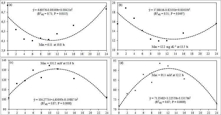 As a reflection of changes in the diet consumption patterns and fermentation of ruminal digesta during the day, a quadratic effect of the sampling time was observed on the pH (P=0.0002) and on the concentrations of N-NH3, acetate, propionate, butyrate and total VFAs in the rumen (P<0.0001) (Figure 1). Thus, the gradual reduction in the ruminal concentration of N-NH3 in the morning (Figure 1b), after intake of the diet by the cows, can be partially attributed to its use by the fibrolytic microbiota of the rumen, which represents the high requirement of this metabolite for fermentation of fibrous carbohydrates with concomitant production of acetate (VALADARES FILHO; PINA, 2007). This was evidenced by the similar times at which the minimum concentration of N-NH3 (12.2 mg dL-1 at 13.5 h; Figure 1b) and maximum concentration of acetate (91.1 mM at 12.2 h; Figure 1d) were observed in the rumen, justifying the negative correlation between these two metabolites of ruminal fermentation (r = -0.76; P<0.05).