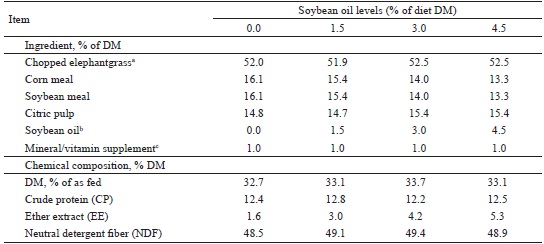 The experimental treatments were four isonitrogenous and isofibrous rations based on chopped elephantgrass with inclusion (DM basis) of 0.0% (control), 1.5%, 3.0% and 4.5% soybean oil (SO). The experimental rations (Table 1) were formulated according to the NRC (2001) to meet the nutritional requirements for a cow weighing 450 kg, producing 18 kg day-1 of milk with 3.5% fat, and gaining 0.2 kg day-1.