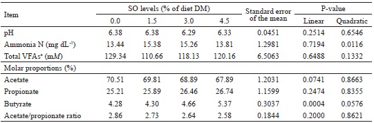 The interaction treatment*sampling time was not significant (P>0.05) for any of the ruminal parameters. The inclusion of SO in the diet promoted a quadratic effect (P=0.0116) on the ruminal concentration of N-NH3 (Table 2) with a maximum value of 15.5 mg dL-1 estimated for the ration with 2.3% SO. The similarities (P>0.05) between diets in relation to the propionate molar ratio and ruminal concentration of total VFAs indicate that the increase in the molar ratio of butyrate in response to inclusion of SO may be related to the reduction (P=0.0741) found for the molar ratio of acetate (Table 2). The interconversion of acetate to butyrate is an important mechanism in ruminal metabolism, since it allows for the oxidation of reduced cofactors for the continuity of the fermentation process (VALADARES FILHO; PINA, 2007). Moreover, a higher production of butyrate over acetate can help prevent ruminal pH reduction (DIJKSTRA et al., 2012), which in the present study was not altered (P>0.05) by the dietary inclusion of SO (Table 2). In diets with high levels of polyunsaturated-FAs, this is particularly important, since the main microorganisms responsible for the biohydrogenation processes of these FAs in the rumen are fibrolytic bacteria, which are sensitive to pH < 6.0 (MARTIN; JENKINS, 2002).