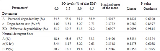 Although the ruminal environment of the cows could be considered adequate for the activity of the populations of bacteria that ferment fibrous carbohydrates (pH > 6.0 and N-NH3 > 10 mg dL-1; VALADARES FILHO; PINA, 2007; Figures 1a and 1b), the inclusion of SO in the diet promoted a linear reduction in the degradation rate of DM (P=0.0282) and the effective degradability (ED) of DM and NDF (P<0.05) of elephantgrass forage (Table 3); comparing the control ration with the 4.5% SO ration, the reductions in these three parameters of ruminal degradation were, respectively, 48%, 13% and 20% (Table 3).