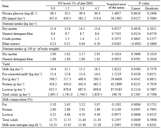 Fat-corrected milk production and contents and yields of protein and lactose were not influenced by the inclusion of SO in the diet (P>0.05). Lactose secretion is mainly modulated by plasma glucose synthesized via gluconeogenesis from the propionate produced in the rumen (SANTOS, 2011). Thus, the absence of an effect (P>0.05) of the inclusion of SO on rumen propionate concentrations (data not shown) and plasma glucose justify the similarity observed between treatments for the milk lactose content (Table 4).