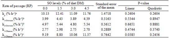 There was no effect (P>0.05) of SO inclusion in the diet on the fluid and particulate rate of passages in the rumen (Table 5). In diets based on hay of tropical grass, Bateman and Jenkins (1998) also did not observe an effect (P>0.05) of the dietary inclusion of 0, 2, 4, 6 and 8% SO (DM basis) on the fluid rate of passage in the rumen (10.30 to 10.74% h-1). These authors observed lower values than those obtained in the present study (Table 5), which can be attributed to the use of non-lactating cows. In a study carried out with lactating cows that were fed corn silage-based diets, Bettero et al. (2013) also did not observe an effect of the inclusion of 2% SO in the diet on the particulate passage rate in the rumen. In general, as presented in Table 5 and corroborating the results reported by Lopes et al. (2008), the ruminal and post-ruminal particulate passage rates obtained from the adjustment of the fecal chromium excretion data to the Grovum and Williams (1973) model were, respectively, higher and lower than those estimated from the Dhanoa et al. (1985) model. According to Ellis et al. (1994), estimates of similar ruminal (k1) and post-ruminal (k2) passage rates (k1 ≅ k2) are inconsistent with the assumptions related to two-compartment models, and based on this, they have recommended that the ratio between these two parameters (k2 ÷ k1) should exceed the value of 1.5 to obtain a reliable estimate of the passage rate. This recommendation allowed for Lopes et al. (2008) to conclude that the process of time-dependence implicit in the multi-compartmental model promoted a better adjustment of the fecal excretion data. These authors, who worked with lactating Holstein x Zebu cows fed chopped elephantgrass supplemented with non-lipid concentrate, reported ruminal and post-ruminal particulate passage rates, estimated from the model of Dhanoa et al. (1985), respectively, from 2.61 to 2.97% h-1 and from 8.17 to 10.94% h-1, that is, close to those obtained in the present study (Table 5).