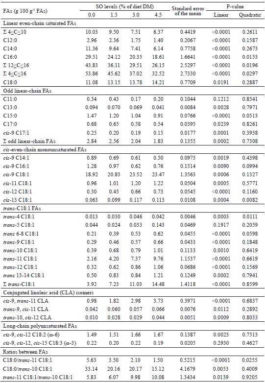 Supplementation with SO promoted linear decreases (P<0.05) in the milk contents of linear even-chain saturated FAs (LECSFAs) (Table 6), which originate from the digestion and absorption of lipids synthesized by the ruminal bacteria, and the de novo synthesis of C13:0, C15:0 and C17:0 FAs, produced by the mammary gland with propionyl-CoA as a primer (KLIEM; SHINGFIELD, 2016). The lower milk LECSFA content in response to SO inclusion may be considered indicative of reduced activity and growth of bacterial communities as a consequence of adaptive changes in the ruminal environment, with a probable higher negative impact on the population of the cellulolytic strains, which are more vulnerable to the bacteriostatic effects of polyunsaturated-FAs (VLAEMINCK et al., 2006).
