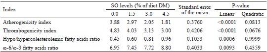 The inclusion of SO in the diet improved the nutritional quality of milk fat, since there was a linear reduction (P<0.0001) in AI and TI and an increase (P=0.0006) in the h/H FA ratio (Table 7). This can be attributed mainly to the decrease in the milk contents of the hypercholesterolemic lauric, myristic and palmitic FAs (FAO, 2010), the concomitant increase in oleic acid content, and specifically considering TI, also due to the increase in stearic acid content in milk (Table 6). The increase (P=0.0093) in the ω-6/ω-3 FA ratio in response to SO supplementation was a consequence of the linear increase (P=0.0023) in the milk linoleic acid content (ω-6), since there was no effect (P>0.05) of the treatments on the α-linolenic acid content (ω-3) in milk (Table 7). However, the ω-6/ω-3 FA ratio is not a useful index as a metric for dietary recommendations aimed at reducing the risk of cardiovascular disease (FAO, 2010).
