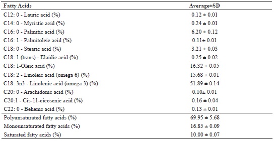 The average EE content of linseed was 27.3%. Further, the fatty acid composition of linseed was consistent with that reported by the American Oil Chemists' Society (AOCS) (FIRESTONE, 2006). The linseed oil consists of 51% omega-3, 15.6% omega-6, 16% monounsaturated fatty acids, and only 10% saturated fatty acids. The concentration of omega-3 fatty acid is three-times higher than that of omega-6 fatty acid, making it the largest plant source of linolenic acid (RAMCHARITAR et al., 2005).