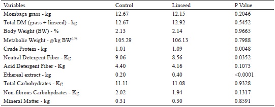 The chemical composition of linseed and pasture potentially ingested by the animals are presented in Table 1. The results revealed the adequate nutritional quality of the mombaça grass with an average crude protein content of 7.5%. The linseed presented higher amount of protein and ethereal extract, which is characteristic of a proteic-energetic feed.