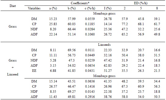 In relation to the mombaça grass, the soluble fraction of the variables, DM, CP, NDF, and ADF, in both the diets (pasture and pasture plus linseed) was similar, except for ADF. However, a reduction in the potentially degradable fraction of the DM and CP in grass was observed in the diet pasture plus linseed when compared with those of the control diet (pasture only). Consequently, there was an increase in the non-degradable fraction of these variables. It has also been reported that in pasture-fed animals, the ED of mombaça grass was higher for all variables analyzed at the pass rate of 2%, 5%, and 8% per h.