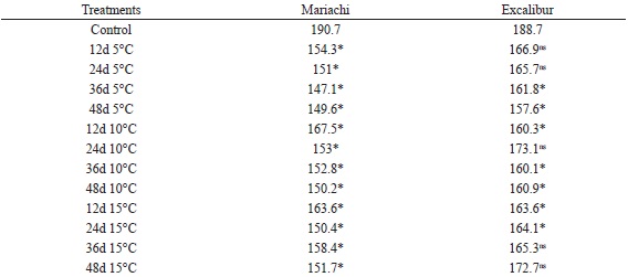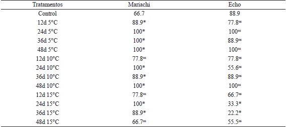Plants from vernalized seeds of cv. Mariachi presented means values for percentage of plants induced to flowering between 89 and 100%, which were higher than the control (66.7%), with the exception of plants from seeds that were vernalized for 12 days at 10 to 15°C and 48 days at 15°C, with average values of 77.8; 77.8 and 66.7%, respectively (Table 1) were similar to those observed in plants from seeds not subjected to cold.