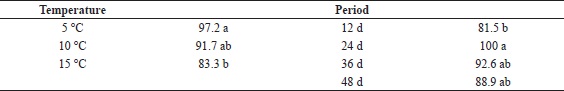 Higher percentage of induced plants, 97.2%, was observed in plants of Mariachi cultivars whose seeds were vernalized at 5°C, similarly to those vernalized at 10°C (91.7%). In turn, seeds that remained for 24 days under vernalization, regardless the temperature, induced flowering in 100% of plants, not differing from plants grown from seeds that remained for 36 or 48 days under vernalization (Table 2), showing that this cold period was sufficient for the induction of seed to flowering.