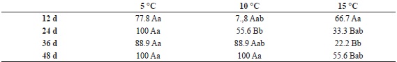 Seeds from cv. Echo, vernalized at 5°C for 12, 24, 36 and 48 days instigated flowering of 77.8, 100, 88.9 and 100% plants, respectively, while in plants from seeds vernalized at 10°C, values were 77,8; 55,6; 88,9 and 100%. Plants from seeds submited to temperature of 15°C had low efficiency regarding flowering, becoming the limiting value in the commercial production of lisianthus, thus seeds of this cultivar need lower temperatures in order to obtain greater flowering efficiency (Table 3). In this context, Xi-heng et al. (2011), observed that vernalization of hydrated lisianthus seeds at 7 - 10°C increased germination rate and the percentage of plants induced to flowering.