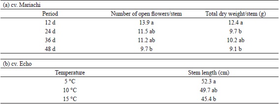 Fresh mass production of floral stems from non-vernalized seeds of cv. Mariachi was 91.6 g, differing from those observed on the stems of plants from seeds that were vernalized for 24 or 48 days at 5 °C, for 48 days at 10 °C and 24 days at 15 °C. Dry mass average value for control was 14.2 g, this value is higher than what was observed in stems of vernalized plants, except from the seeds vernalized for 12, 24 and 36 days at 5 or 10 °C and 12 and 36 days at 15 °C. The number of open flowers per stem in plants from non-vernalized seeds, 16.3, was similar to that observed in plants from vernalized seeds, except for the number of flowers in plants from seeds vernalized for 48 days at 10 ºC, 8.9 (Table 5).