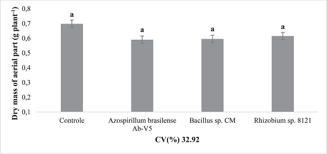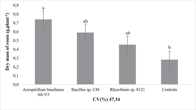 The experimental design was completely randomized and composed of four treatments, control - without inoculation, Azospirillum brasilense strain Ab-V5, Rhizobium sp. strain 8121, and Bacillus sp. strain CM. The experimental units were composed of three-liter polyethylene vases. For filling, a 1: 1 mixture of soil and sand was used, both sterilized previously in an autoclave. At sowing, three seeds per experimental unit were used, remaining, after thinning at 11 days after sowing (DAS), one plant per vase.