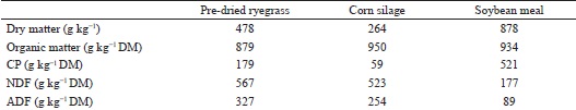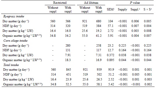 The substitution rate (SR) was calculated by the ratio between the amount of ryegrass that was no longer ingested and the amount of supplemented forage (corn silage) consumed: