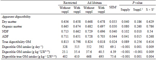 No effect was observed for the interaction between supply and supplementation for the digestibility of DM, OM, CP, and dietary fibrous fraction (Table 3). The apparent digestibility of DM and OM were similar between treatments, but the digestibility of NDF and ADF were lower (P<0.05) in supplemented animals when compared to those not supplemented and those that received the pre-dried in a restricted amount when compared to those that received pre-dried ad libitum. The total intake of digestible OM increased with supplementation in animals receiving the pre-dried in a restricted amount but did not vary in animals that received pre-dried ad libitum (interaction supply × supplementation: P<0.001).