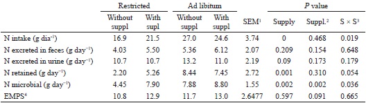 Nitrogen retention did not vary in animals that had offered ad libitum, but in restricted supply, it was higher in supplemented animals. This can be explained because in the restricted diet without supplementation, the animals did not have sufficient digestible organic matter that allowed a higher microbial growth and N retention. According to Cameron et al. (1991), microbial protein synthesis and microbial growth depend on an adequate amount of energy and nitrogen for the synthesis and assimilation of amino acids. In this sense, the values of N excreted in the feces in the restricted supply varied according to the consumption of DOM. This is explained because most of the nitrogen excreted in the feces is of microbial origin, being referred to as endogenous, which increases linearly as a function of consumption (KOZLOSKI, 2011).