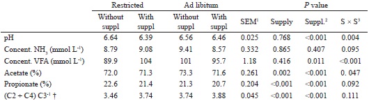 The highest values of ruminal pH and the lowest concentrations of VFA were observed in animals without supplementation and with restricted supply, while the highest proportion of acetate was observed in animals non-supplemented with ad libitum supply (interaction supply × supplementation: P<0.001) (Table 5). Propionate concentrations decreased (P<0.001) and relations (acetate + butyrate) propionate-1 increased (P<0.001) in supplemented animals when compared those non-supplemented, regardless of the supply. The average concentration of N-NH3 did not change with either supply or supplementation.