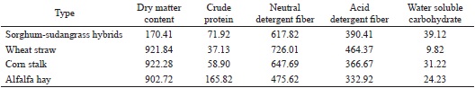 Recent research on ensiling technology for sorghum-sudangrass hybrids has focused on the regulation of silage materials (AKDENIZ et al., 2012; BI et al., 2018; GUL et al., 2008; JIANG et al., 2005) and additives (DOLEZAL, 2009; HAN et al., 2015; ZHANG et al., 2010). Chopped straw is a most effective absorbent, consequently, mixing straw with grass is an accepted technique for reducing effluent loss, increasing dry matter and improving fermentation quality of mixed silage (GALLEGOS et al., 2018). Therefore, we suppose mixing straw with sorghum-sudangrass hybrids could improving the fermentation quality of mixed silage. However, mixed silage of sorghum-sudangrass hybrids has not been well explored. In this study, the nutritional characteristics of silage materials, including the nutritive value, fermentation quality, 72h dry matter digestibility, and gas dynamics were examined in vitro in a simulated rumen fermentation system of sorghum-sudangrass hybrid silage mixed with various quantities and kinds of hay. The results of this study provide a scientific foundation for the production of high-quality sorghum-sudangrass hybrid silage.