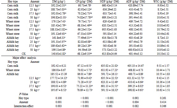 As shown in Table 2, there were interactions between hay type and adding amount in DM and CP contents (P < 0.05). The best combination in DM and CP contents was adding 50 kg t-1 alfalfa hay. There was no interaction between hay type and adding amount in NDF, ADF and WSC contents (P > 0.05).