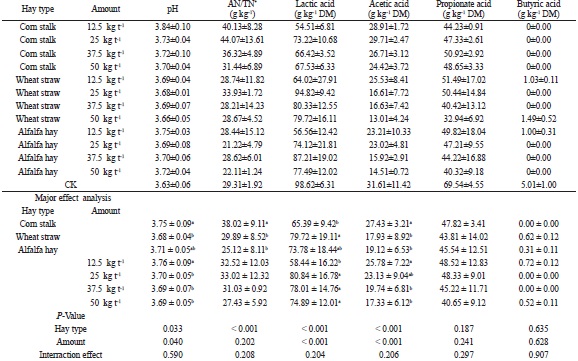 As shown in Table 3, there was no interaction between hay type and adding amount in pH, AN/TN, LA, PA, AA and BA contents (P > 0.05).