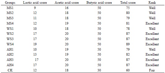 The moisture content of sorghum-sudangrass hybrids is very high, providing a favorable environment for the proliferation of Clostridium spp. (WEI; WANG, 2010). Butyric acid secreted by Clostridium spp. has a bad odor and decreases the fermentation quality of silage (BORBA et al., 2012). In the present study, the FLIEG’s score evaluation ranking for separate silage was only “Fair” owing to a higher content of butyric acid, which means that sorghum-sudangrass hybrids could be ensiled alone, but the fermentation quality was not good. This result was consistent with those of Ji et al. (2012). All mixed silage of sorghum-sudangrass hybrids had a good fermentation quality.