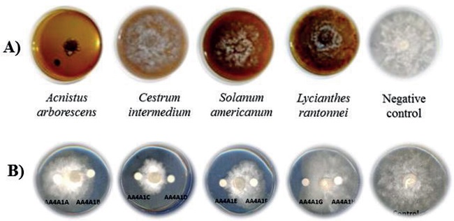 Of the four Solanaceae family plant crude extracts, only the A. arborescens extract demonstrated any activity against P. cinnamomi mycelial growth in bioassays (100% inhibition), as shown in Figure 1A. The other 3 extracts had no activity (0% inhibition) against this oomycete. Studies have shown that plants belonging to the genus Acnistus harbor various chemical components, such as flavonoids, alkaloids, and terpenes, among others, and many of these compounds may have activity against microorganisms (ROUMY et al., 2010).
