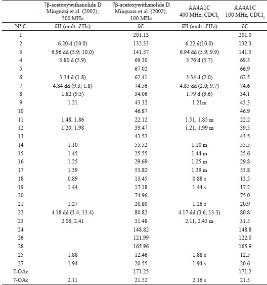 With the data obtained in the 1H NMR and 13C NMR spectrum (Table 1), it was possible to correlate the hydrogen and carbon shifts (δH) of AA4A1C with the compound 7β-acetoxywithanolide D (Figure 2), also known as 7β-acetoxy-4β,20R-dihydroxy- 5β,6β-epoxy-1-oxo-witha-2,24-dienolide) (MINGUZZI et al., 2002).