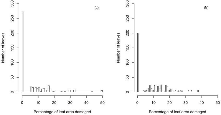 In the summer-fall crop seasons of 2014 and 2015, 60.4% (272 leaves) and 44.2% (199 leaves) of leaves, respectively, were recorded as undamaged ( Figure 1), and the null results (excess of zeros) observed in the assessments of severity could be considered an additional evidence demonstrating the tolerance of the seedless table grape against downy mildew. Therefore, it was necessary to propose a mathematical model to analyze disease progress as a function of time. Goodness-of-fit statistics showed that the generalized chi-square of Pearson/DF equals approximately one, and the residual analyses provided a check of the model’s goodness-of-fit. Data must be close to the progress curve to describe what it is happening to ensure that decisions are carried out reliably.