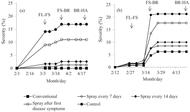 Abstract: Downy mildew caused by Plasmopara viticola is a major disease of grapes in Paraná State, Brazil and other wine-producing regions. The seedless table grape ‘BRS Vitória’ stands out for its tolerance to this disease and is a viable alternative to reduce fungicide applications. The objectives of this study were to analyze the influence of weather-related factors, such as temperature and rainfall on disease progress and to evaluate the efficacy of fungicide spray programs for controlling downy mildew of grapes during the summer-fall and winter-spring crop seasons in northern Paraná, Brazil. Field trials were conducted in Marialva, Paraná, during the winter-spring crop seasons (August to December) in 2013 and 2014 and the summer-fall crop seasons (January to May) in 2014 and 2015. The experimental design used was completely randomized with repeated measurements over the phenological periods, with five treatments and 10 replicates. The following treatments were compared: (1) conventional, in which fungicides were applied according to conventional standards; (2) preventive fungicide sprays every seven days; (3) preventive fungicide sprays every 14 days; (4) fungicide sprays after observing the first downy mildew symptoms; and (5) no fungicide sprays. In the conventional fungicide program, sprays were performed two or three times per week. Treatments 2 and 3 received sprayings between the start of branch budding and fruit ripening. In treatment 4, sprays started from the first occurrence of oil spot symptoms, and then, the applications were spaced every seven days until fruit ripening. The severity of disease was evaluated weekly. The disease was severe only in the 2014 and 2015 summer-fall crop seasons, reaching a maximum severity of 17.3% and 21.3% of the leaf area, respectively. The highest disease severity in the summer-fall crop seasons was associated with higher frequencies of rainy days and higher temperatures. Disease severity in conventional treatments did not differ from severity in treatments with sprayings made every seven and 14 days during the summer-fall crops in both years. Severity index on bunches were not observed for the evaluated trials. The seedless grape ‘BRS Vitória’ is less dependent on the use of fungicides to control downy mildew in northern Paraná.