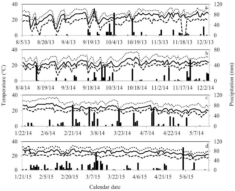 The summer-fall crop seasons showed higher frequencies of rainy days and higher daily minimum temperatures compared to the winter-spring crop seasons ( Figure 3). In the summer-fall crop season of 2015 829.7 mm of rainfall was recorded within a period of 52 days. Moreover, precipitation was recorded at 754.4 mm over 41 days in 2014 ( Figures 3c and 3d). High humidity and temperatures above 18ºC are considered major epidemiological factors determining downy mildew epidemics in northern Paraná ( TESSMANN et al., 2007). In fact, growth and sporulation of P. viticola occurs at temperatures of 18º to 25ºC, and temperature is responsible for accelerating or slowing the development of the disease ( TAVARES et al., 2000; SÔNEGO et al., 2005).